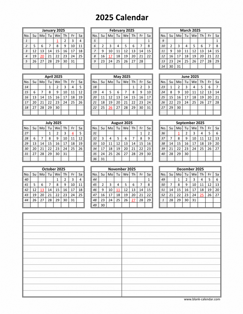 Yearly Printable 2025 Calendar With Notes WikiDates