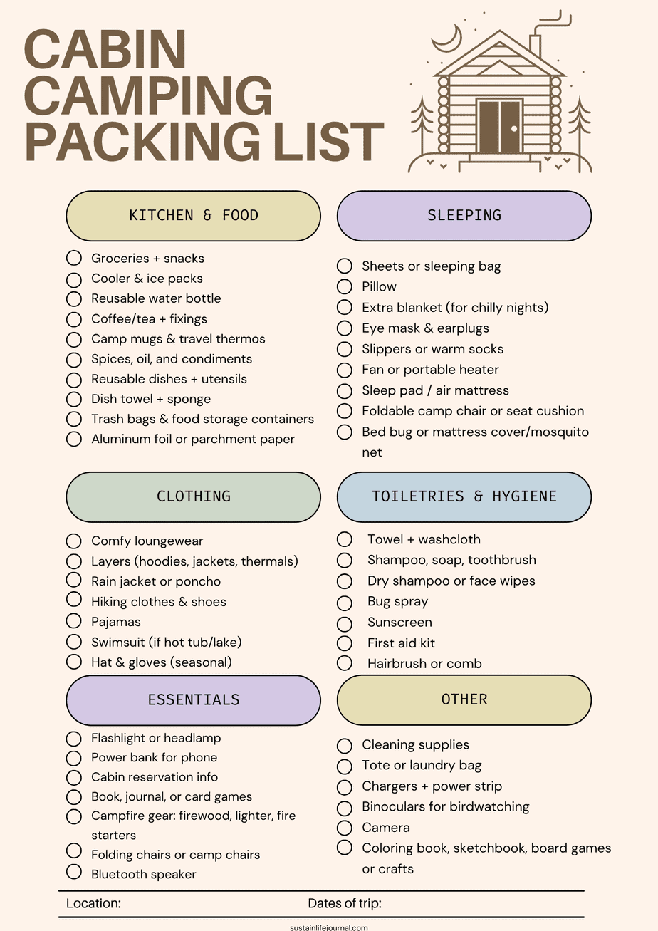 Ultimate Cabin Camping Packing List Checklist Printable Sustain