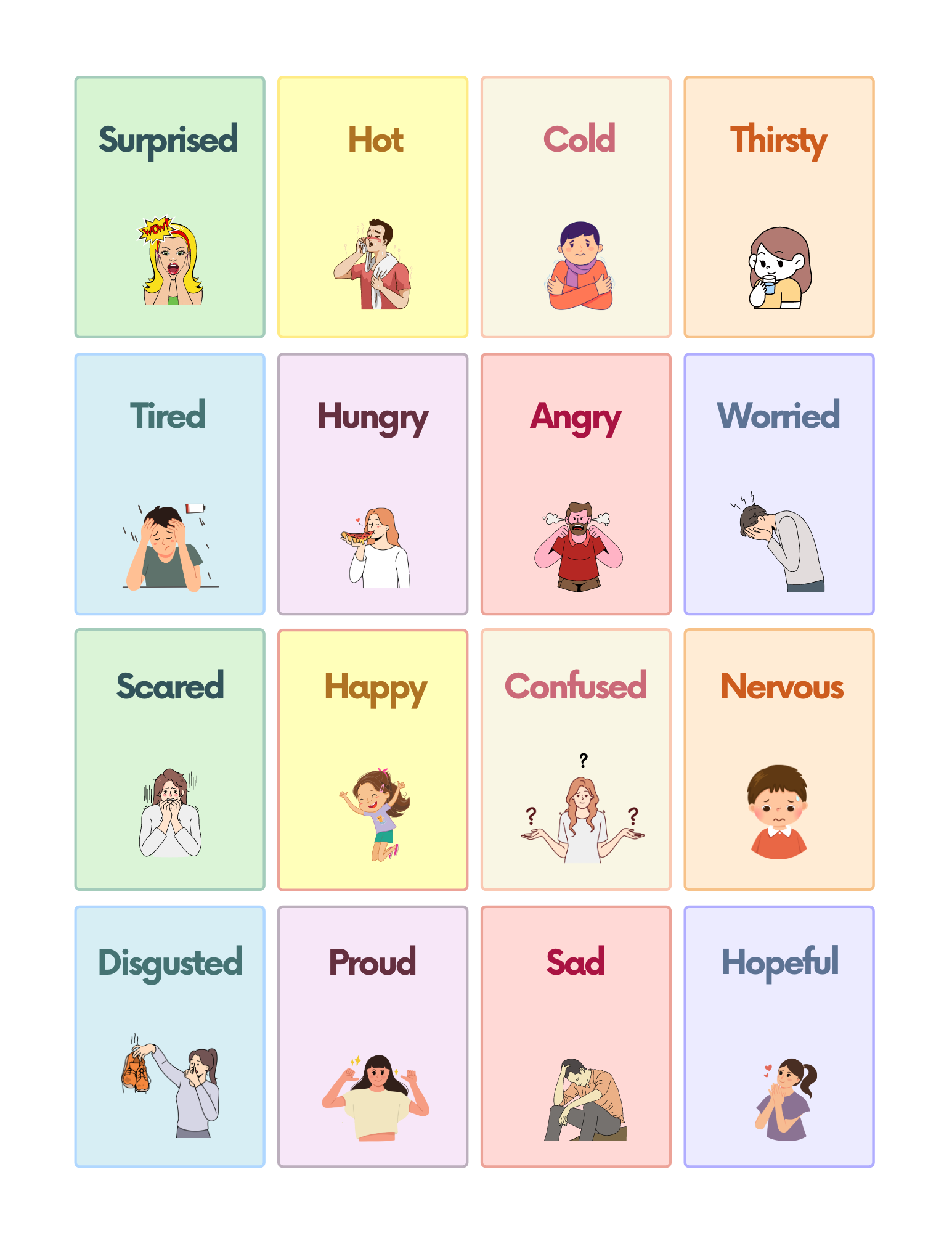 Whether you’re at home, in the classroom, or on the go, these printable flashcards are a convenient and versatile resource for teaching emotions. You can use them in games, activities, or as a visual aid during discussions about feelings and social skills.