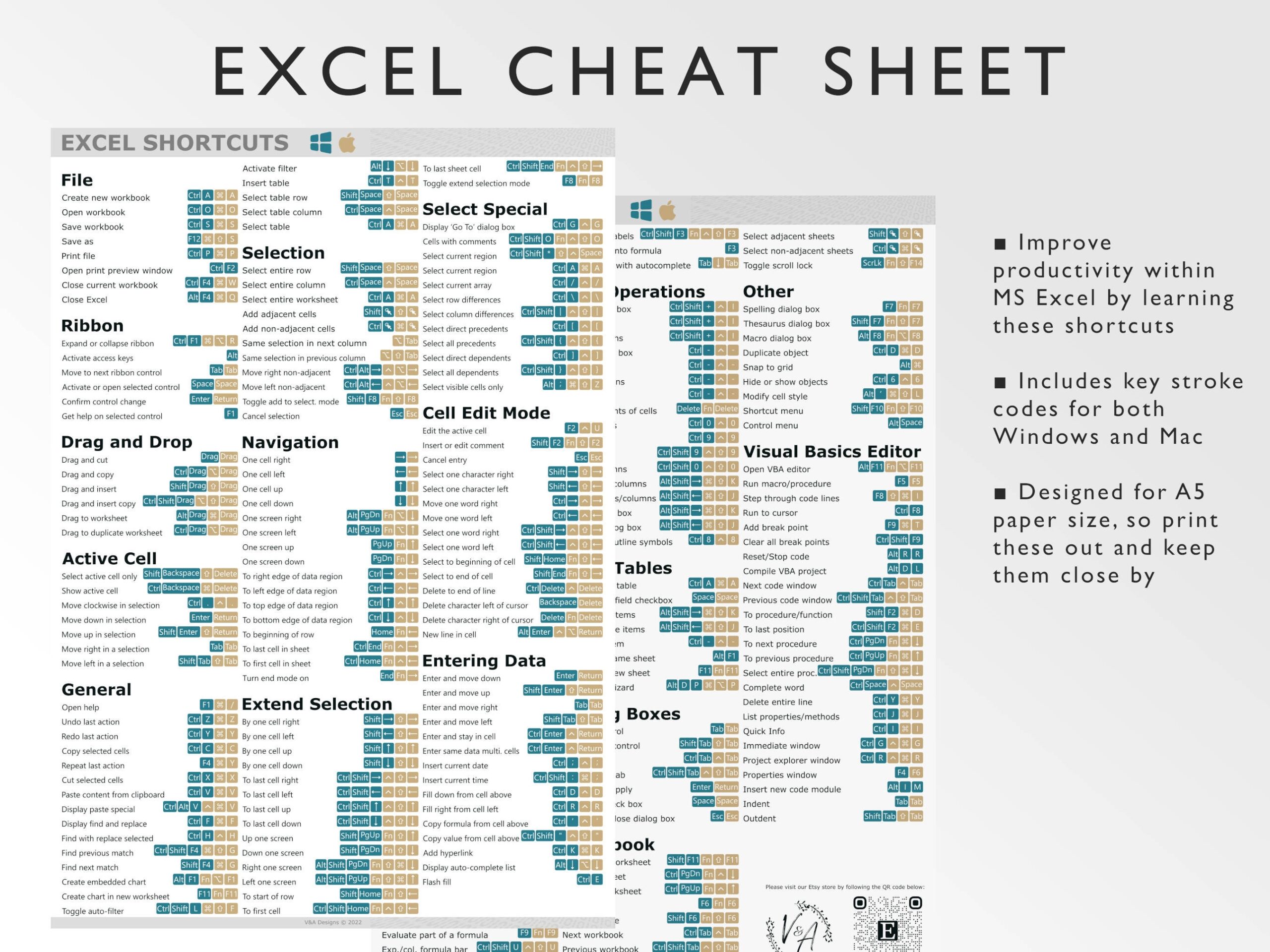 Microsoft Excel Shortcuts Printable Excel Cheat Sheet Workbook Productivity Excel Key Strokes Windows Mac Excel Ninja Gold Etsy New Zealand